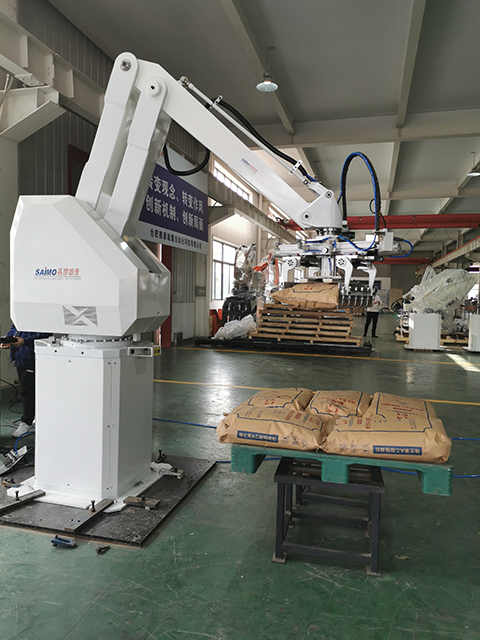 码垛机是将装入编织袋的物料或者是经过包装和未经包装的规则物品,按一定排列码放在托盘(木质)上,进行自动堆码,可堆码多层,然后推出,便于继续进行下一步包装或者叉车运至仓库储存。码垛机实现智能化操作管理,可减少劳动人员和降低劳动强度。 全自动包装码垛设备广泛用于石化、食品、医药、饲料、粮食、有色矿物和建材等行业中的粉状、粒状物料、规则有一定体积物品的自动包装和自动码垛。