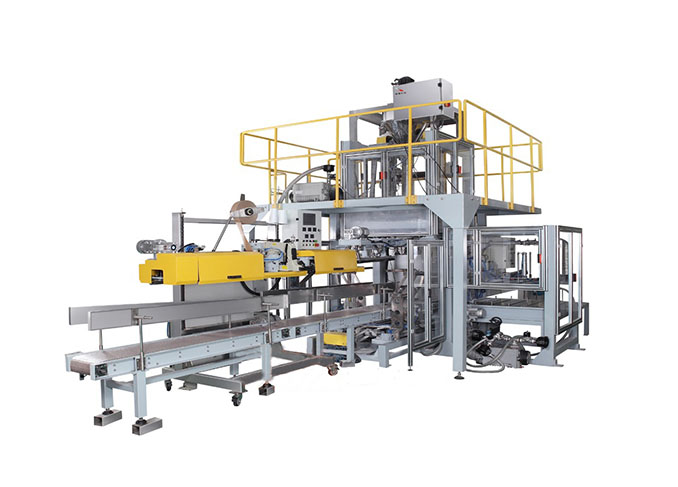 赛摩智能针对化工、粮食、农化、食品等行业的大袋子粉末物料包装而设计的新型包装机机组,该机组具有自动称量、自动上袋、自动填充、自动送包、自动封口等功能。可与后道码垛机器人等设备实现联动,实现大规格包装、码垛无人化作业。