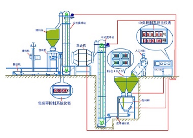 该套生产线广泛应用于各类物料多行业的自动配料包装生产线,配料只需人工将2种以上10种以下的物料投入各料仓中,电脑控制系统自动将各种物料按预先设定好的比例自动投放到称重系统中,称重系统将 按照每种物料的配料比例自动加入,每一次配料完成后由斗式提升机自动将物料提到混合机中进行混和,混合均匀后自动排出再由斗式提升机提到储料仓中供给包装 系统进行自动定量包装。