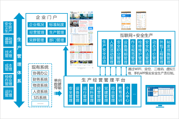 缩进互联网+安全生产管控平台集成生产MIS系统、SIS系统,在PC端和移动端实现设备、缺陷、两票、运行、点检、工单、安全、燃料、物资、计划、合同、经营等业务功能,通过WIFI、二维码、蓝牙、移动终端等设备联接生产区及办公区,构建全方位、全要素运营管控体系。