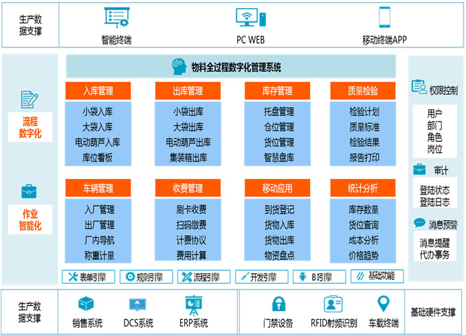 物料全过程数字化管理系统,应用人工智能、RRID射频识别、移动应用等先进技术,对物料作业流程进行全过程闭环管控,使信息流、物流、车流、资金流保持一致,实现物料入库、出库、库存的高效管理,实现作业流程智能化。