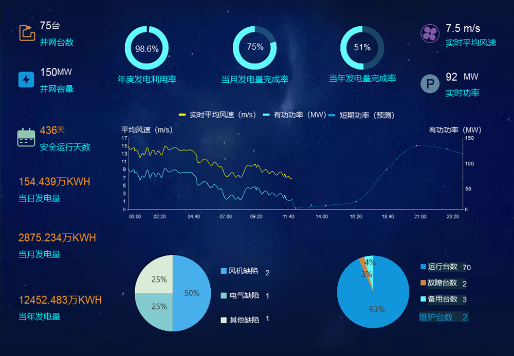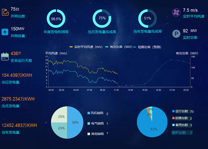 在满足安防规定的条件下,获取各场站生产大区及管理信息大区的实时数据、非实时数据。以工艺图的方式展示区域生产单位设备的运行情况,包括设备参数的趋势查询、设备的状态显示,各场站的主接线图、风机机位分布图。支持可视化方式展示各场站单位的风资源、实时负荷、机组运行状态数量等实时数据。