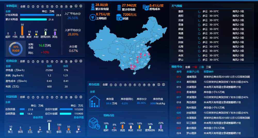 缩进规范原料管理流程,以原料自采购到入炉全过程管理为主线,在原料数据完整可采集基础上,全面展示二级单位及下属生物质电厂原料的进、耗、存、量、价,每日以图形化的方式多维度自动生成原料数据主体分析页面,进而反映各单位原料的管控水平。