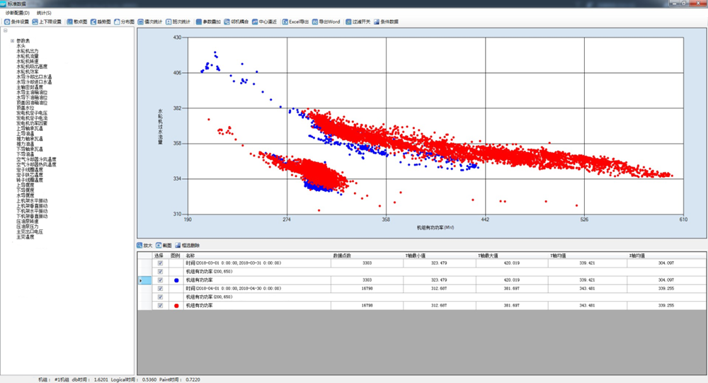 缩进应用大数据挖掘算法,对水头、导叶开度、效率、出力、空化系数、压力脉动等参数或指标的历史数据与实时数据进行计算和分析,得到水轮机最佳运行性能与实时运行性能。实时在线监测水轮机运行情况,指导运行人员。
