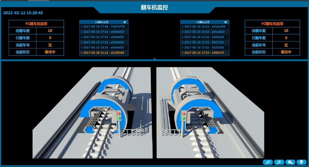 缩进从输煤程控系统等系统采集数据,基于堆煤、取煤数据,动态显示当前煤场设备状态图,用于掺配执行监视,与掺配系统结合应用。通过监视画面或模拟图形可以浏览斗轮机在特定时间内的运行轨迹及路径。与翻车机通过接口对接,读取翻车机运行状态,并记录当前翻车的车号、已翻车数、翻车时间等信息,对翻车机进行实时监控,形成火车入场卸车信息。
